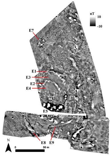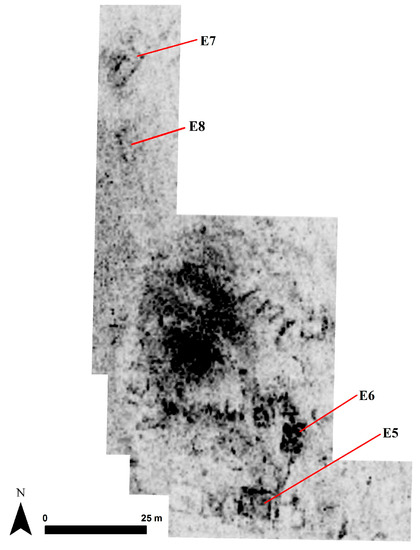 Southern portions of E1 and E2 are magnetically empty. In comparison to the rest of the data, these two areas (E3 and E4) must have contained very limited number of features and must have hosted a different kind of human use of space, but not habitation. The prospection further reveals highly burnt structures to the south of the settlement (E5). They are aligned on east–west axis except for the one located further north from this cluster (E6). Their magnetic signatures suggest intensive burning and mask any visible internal partition.