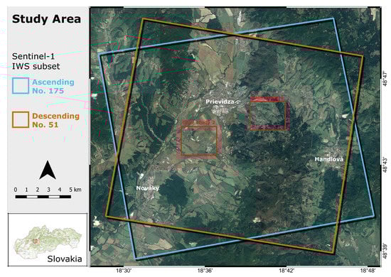 Slope deformations are the most significant geohazards in Slovakia which annually cause an extensive economic damage, seriously limit the rational use of land and in rare cases also threaten human lives. This is conditioned by the complex geological setting of Slovakia, especially in Flysch regions and periphery of Neovolcanic regions, where landslides threaten up to 60% of the territory. Slopes within Neogene and Paleogene depressions are also substantially affected. Moreover, the activation or re-activation of relatively large amounts of landslides has been witnessed in recent years. Since 2010, more than 700 new slope failures have been registered and their activation was driven mainly by climatic anomalies, such as extraordinary rainfalls and melting snow cover. Many of these landslides currently represent a direct threat to the lives, health and property of the residents in the affected areas []. This fact has initiated their inclusion in the monitoring system built within the scope of the project “Partial-monitoring system—geological factors“ [,]. The stability condition of these sites is being observed by systematic geological, geotechnical (groundwater table level, borehole inclinometers), and geodetic (GNSS, levelling) measurements, as well as regular evaluation of climatic factors. All those conventional in-situ terrestrial monitoring methods, however, provide only point-wise information about temporal evolution of deformation phenomena, while requiring laborious and regular measurement campaigns. Another geohazard posing a threat for the residents of Slovakia is a subsidence due to undermining, related to the present or historical exploitation of brown coal, various ores or salts. Brown coal mining is still in operation in the Upper Nitra region in Central Slovakia, where a collapse due to undermining has led to the abandonment of two municipalities, or their parts—Laskar and Kos. Coal mining in the Upper Nitra region has been operated by the Hornonitrianske bane (HB) Prievidza Mining Company, which has also been monitoring the undermining subsidence using the classical geodetic survey at the surface and extensive underground monitoring by the methods of mining geodesy.