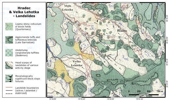 - Ilkanič, A.; Jasovská, A.; Nigrínyová, J.; Pilko, M.; Vasiľko, T.; Smrek, M. Engineering Geological Survey of the Affected Sites in Velka Lehotka and Hradec; Final Report; MoE SR, SGUDS Archive: Bratislava, Slovakia, 2013; p. 50. (In Slovak) [Google Scholar]