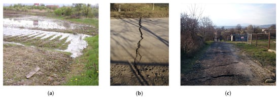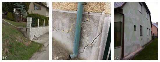 Photo-examples of structural damage in Hradec and Velka Lehotka (case study 1) caused by local slope deformations, (a) April 2012, Photo courtesy: Google Street View; (b) and (c) July 2017.