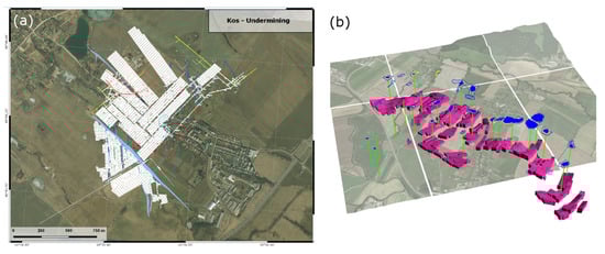 Case study 2: Undermined area of Kos village, Upper Nitra region. (a) White areas represent undermined corridors as of May 2017; (b) 3D model of the Cigel brown coal deposit—blue: ponds and wetlands, violet: mined out blocks (thickness exaggerated 3×) and green: perpendiculars from the lake centers.