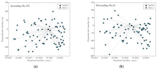 We performed MT-InSAR ground stability analysis over the wider Upper Nitra region, utilizing 150 C-band Sentinel-1 SAR images per both of its ascending (78) and descending (72) orbits, which cover the time period from November 2014 till March 2017. Figure 1 depicts subsets of Sentinel-1 IWS scenes for ascending track No. 175 and descending track No. 51 over the area of interest (AOI). Due to very small perpendicular baseline distribution secured by stable Sentinel-1 orbital tube, as well as regular temporal sampling of acquisitions, forming single-master image combinations provides stable and rigorous geodetic time series []. Interferometric image combinations employed in processing are represented by Figure 5. Master images were selected approximately in the barycentre of the temporal and perpendicular baseline domain, with regard to atmospheric conditions during the time of acquisition. Hence the acquisition time of master images were chosen so that no precipitation or notable overcast was reported [].