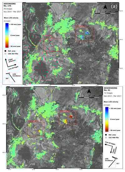 Mean line-of-sight (LOS) deformation velocity maps produced from (a) ascending and (b) descending Sentinel-1 stacks. Outlier elimination has already been performed. Red values indicate movement away from the satellite, whereas blue values indicate movement towards the satellite. Basemaps: Google, 2017 CNES.