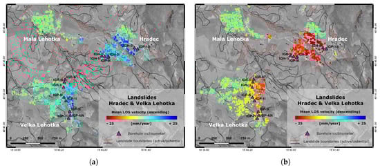 Hradec and Velka Lehotka landslides as observed by Sentinel-1 MT-InSAR: mean line-of-sight (LOS) deformation velocity maps from (a) ascending and (b) descending track. Purple triangles represent borehole inclinometry monitoring network. Basemap: Google, 2017 CNES.