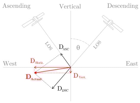 Interpretation of surface movements is generally challenging when dealing with LOS displacement velocities. Assuming major sensitivity to vertical displacement and ignoring the presence of a potential horizontal one can introduce large errors into the final estimates if using mere projection via incidence angle []. Moreover, Sentinel-1 TOPS acquisition look angles are way larger than those of legacy ERS or Envisat satellites, what further expands this vulnerability. Yet, thanks to the availability of both acquisition geometries, LOS velocities can be further decomposed into vertical component and horizontal component in descending azimuth look direction (Figure 9).