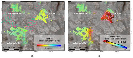 Decomposition of InSAR LOS velocities (Figure 8) into (a) vertical component and (b) horizontal (approximately E-W) component. Basemap: Google, 2017 CNES and ZBGIS topography, GKU Slovakia.