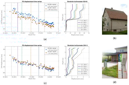 (a); (c) Comparison of InSAR derived LOS displacement time series (from descending track) with borehole inclinometer measurements at points IGH-5i (depth of shear zone: 4.61 m, mean displacement velocity: 18.9 mm/year, orientation: northwest-west) and IGH-1i (expected depth of shear zone: 3.44 m, mean displacement velocity: 1.2 mm/year, orientation: southwest), adjacent to (b); (d) disrupted structures.