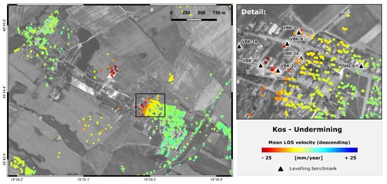 Nonetheless, we managed to retrieve several reliable PSs in the southeastern part of village from the descending track, which exhibit coherent deformation as depicted by Figure 12. While the smaller-magnitude subsidence is noticeable even at PSs remote from mining affected areas, displacement values slowly increase towards the directly undermined territory, reaching rates higher than 3 cm/year. Since results from the ascending track are generally noisier and without coherent points over the affected area even after multi-variate outlier elimination (see Figure 7), LOS decomposition was not performed.