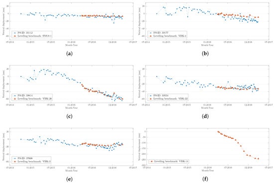 Comparison of PS deformation time series (from descending track, projected onto the vertical component) with levelling. Points (a) SNS-8.1; (b) VBK-4; (c) VBK-20; (d) VBK-22; (e) VBK-3; (f) VBK-14.