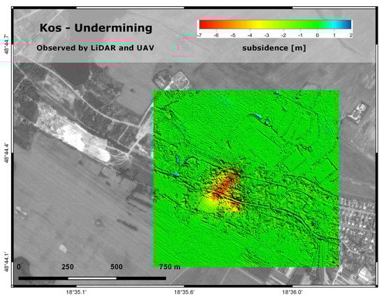 Brown coal in Upper Nitra is stored in Neogene deposits at the depth of 200–250 m with 2.5–28.4 m thickness, and other layers with 2.5–8.9 thickness are present in 120–510 m depths. Mining takes place in those depths without the fill, what is considered a technological peculiarity of this area. The large extent of long-term brown coal mining of the Cigel brown coal deposit (at a depth of around 200 m) activates surface deformations in the above area of Kos village (Case study 2: Figure 4) and spatially devastates the countryside. Since 1950, a building closure was declared in the north-western part of the Kos village, and mining began in 1988. Notable negative influences of mining are related not only to the ecosystems of the original landscape, but also to demographic changes due to the evacuation and withdrawal of former inhabitants. Population of the village has since decreased from the original 3500 to today’s approximately 1200 inhabitants. The undermined areas of ≈158 ha are affected by strong subsidence movements, and the formation of several depressions (over area of ≈58 ha) is evidenced. Number of slope failures are induced over the undermined fields, which are continually subsiding during the mining activities. Therefore, the location, total area and depth of the depressions are changing dynamically over time. The predicted maximum decrease is in the range of 4–7 m with 3–5 m depth of the groundwater table level, what has resulted for example in formation of wetlands [].