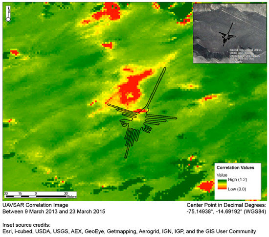 In March 2013, UAVSAR data were collected opportunistically over the Nasca Lines, when the UAVSAR platform flew over them during a deployment to image volcanoes in Chile, simply to see how the lines and geoglyphs might appear in airborne SAR imagery. A second UAVSAR data set was gathered in March 2015 to see if the production of a very high-resolution correlation image could allow for the detection and measurement of disturbance to the geoglyphs, and to the Hummingbird geoglyph in particular. After examination of the correlation image, it became apparent that UAVSAR data could be used not only to evaluate damage to the Hummingbird geoglyph and the area immediately around it, but also to detect other ways in which the Nasca Lines had been disturbed and, more importantly, could be further disturbed in the future [26].