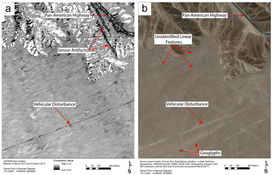 Among the more remarkable applications of the UAVSAR correlation images is in revealing the unpaved paths and roads that were traveled between data takes. Figure 4 shows disturbance to a dirt road leading from the Pan-American Highway in the east to a power line running across the pampas in the west. In satellite imagery of the same area, there is little to distinguish this road from other, nearby lines on the ground, which may be geoglyphs, trails, or other dirt roads (during fieldwork, the features labeled as geoglyphs at the bottom of Figure 4b were positively identified). The correlation image, however, clearly shows that this particular road was disturbed. Also visible in Figure 4a are signs of interference with SAR waves by vehicles on the Pan-American Highway. These so-called sensor artifacts have no association with features on the ground.