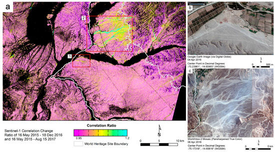In interpreting Figure 8, it is helpful to note that the ENSO cycle produced torrential rainfall in the Nasca region during the first three months of 2017 [36]. The area marked by box 2 in Figure 8a includes substantial terrain, with many ridges and valleys. We suggest that the correlation change in this area (indicated by green and yellow) is the result of flooding, because the areas showing change correspond with what appear to be watercourses. Here, as in other parts of the Nasca Lines World Heritage Site, there are lines and geoglyphs that could be damaged or threatened. Correlation change images like the one in Figure 8a can be useful in assessing weather-related and other disturbances within World Heritage Sites, particularly in regions that are difficult to access.