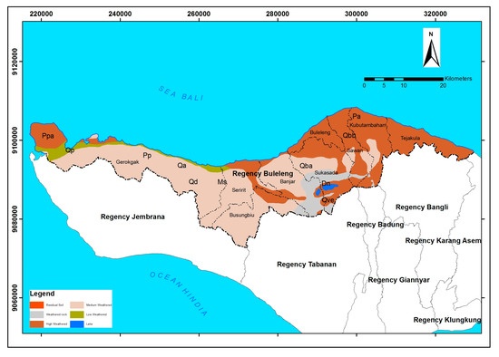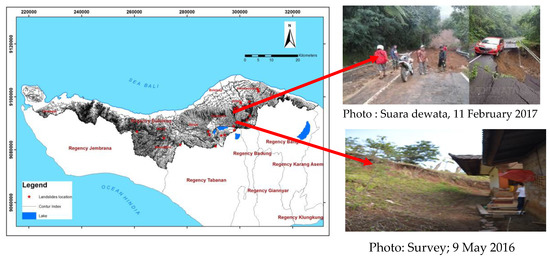 Bali island is characterized by generally steep rolling hills in the northern part and steep plane morphology in the southern part [8]. The geological structure of most areas of Bali island is composed of clastic volcanic rocks from the Quaternary age. Rocks in the northern part of Bali island have been strongly deformed, marked by the many geological structures including both faults and folds. The Flores Thrust stretches from the north to the south of Bali Island, while the eastern part consists of the tuffs and volcanic breccias which were formed in the Pleistocene age (dating back from 2.33 ± 0.12 million years to 0.77 ± 0.06 million years ago), and are very easily eroded by rain [9]. There are various geological conditions and geological structures in each region, which are the dominant controlling factors in the evolution of landforms and geological structures, and these dynamics are reflected by landforms [10,11]. In addition, a landslide with a gentler slope occurs with a lower dynamic coefficient of friction values, and in the case of the debris flow, there tends to be an even lower dynamic friction as compared to the case of landslides high slope declination [12]. The Buyan-Beratan Purba volcanic rock group (Qpbb), consists of tuffs and volcanic lava sediment from Buyan-Beratan and Batur, which are from the upper Quaternary age. The appearance of landscapes and geological conditions is based on the geological map of Bali sheet [13].