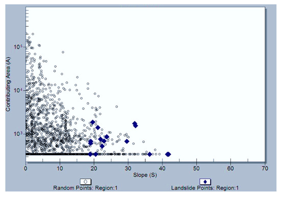 SINMAP modeling showed the spread of landslide points based on the slope and area (S-A plot) as shown in Figure 3. The unstable slope stability level generally started to occur on the slope inclination between 20° and 40°, with the area covering almost 1000 m2. Based on the density of plot points through which we could also find the distribution points of landslide spots; the spread of most landslide points was on a slope inclination between 20° and 25°.