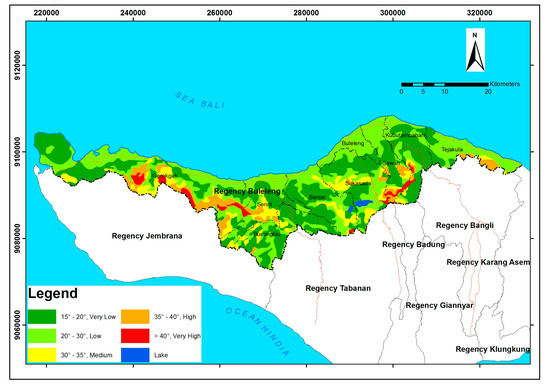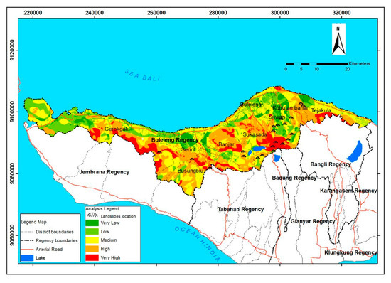 The data of landslide occurrence points as shown in Figure 1 served as a comparison of whether the resulting map matched the reality in the field or not. The location of control points taken for the study was divided into two parts, namely, the locations which were considered stable, and the locations which were considered less stable. Stable locations were taken at several points in urban areas and the less stable areas were taken at some points in the Sukasada sub-district area, an ancient mountainous area of the Beratan-Tamblingan-Buyan region prone to landslides, based on the information on landslide disasters and the information from the Buleleng district community.