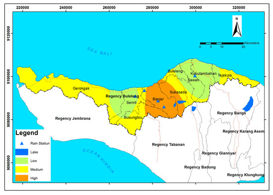 Table 3 and Figure 4 show a map of the soil movement hazard based on SINMAP modeling. The soil movement hazard level in the Buleleng district was rated at a moderate to high level. The medium hazard level was 9.39%; in an area of 12,831 ha, including total landslide events, there were as many as 13 landslide points with a landslide density of 0.0001 landslide per ha. The high hazard level was 0.19% or 253 ha with landslide events, with as many as five landslide points and a landslide density of 0.0004 landslide per ha.
