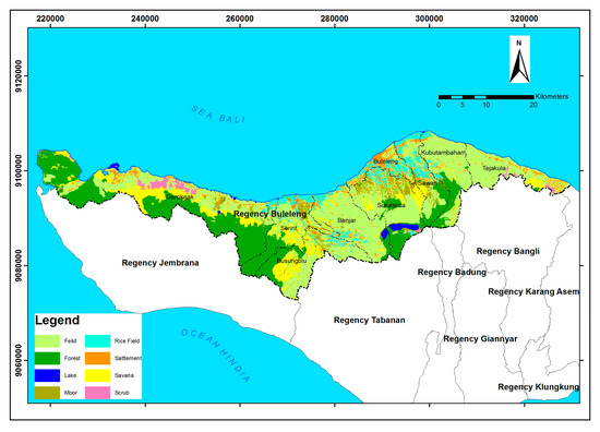 Based on the Indonesia Topography Map of Bali Province with a scale of 1:25,000, vegetation coverage classes were categorized into: shrubs, forests, fields, grasslands, plantations, irrigated paddy fields, and rain-fed rice fields. Land usage types such as rice fields or moor and scrub, especially in areas that have steep land, usually experience frequent landslides. Figure 11 shows the vegetation coverage of the research area.