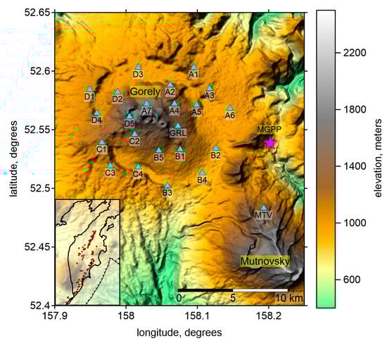 Topographic map of Gorely and Mutnovsky volcanoes. Blue triangles are seismic stations. Magenta star indicates the location of the Mutnovsky geothermal power plant (MGPP). GRL and MTV are the permanent stations of Kamchatcka Branch of Geophysical Survey (KBGS). Inset shows the Kamchatkan peninsula, trench and volcanoes (red dots). The study area is indicated by the yellow dot.