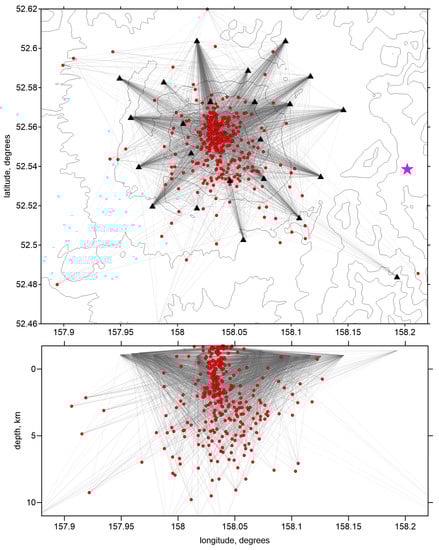 Identification of seismic events and picking of P and S wave arrival times were performed manually using the DIMAS software (version 11 July 2013) designed specifically by KBGS to analyze volcanic seismicity []. To identify relevant events, we used a band-pass filter in the range of 2–8 Hz. Most of the seismic activity was associated with tremors and drum-bit events, which could not be used for tomography. On some days, the KBGS reported more than 200 events; however, they were mostly identified as drum-beats events or tremors that are not suitable for time picking. We were only able to find 360 local earthquakes with detectable P and/or S wave arrivals. An example of the processing procedure for one such event using the DIMAS software is presented in Figure 2. The piking errors were strongly dependent on the magnitudes of events and on the recording conditions. For weak events, the error was maximum and reached 0.5 s for both P and S-waves. The locations of all identified events are shown in Figure 3.