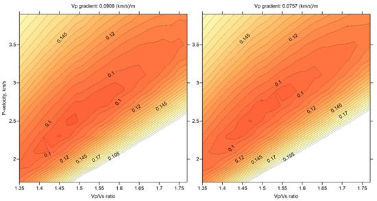 Preliminary source locations were calculated using a grid search method that ensured robust hypocenter determination corresponding to the global extreme of the target function []. To speed up the calculations, we computed travel times by integration along straight lines using velocity according to the 1D starting model. For the existing source-receiver configurations, the deviations of the 1D-velocity-based rays from the straight lines are relatively small; thus this method appeared to be an adequate approximation for the case of Gorely. Before starting the tomographic inversion, we searched for the optimum reference 1D velocity model. At this stage, we calculated source locations in a series of 1D models and compared the computed data fit as mean residual deviations in the L1 norm, which is less sensitive to the presence of outliers. Each velocity model had a constant depth gradient and a constant Vp/Vs ratio. We conducted a grid search for the P-wave velocity in the uppermost level at 3 km a.s.l. in the range of 1.7 km/s to 3.9 km/s with an increment of 0.2. For the Vp/Vs ratio, the grid search ranged from 1.35 to 1.77 with an increment of 0.02. Furthermore, we considered several cases with different gradients of P-wave velocity. Figure 4 presents the results of the grid search optimization for two velocity gradients: 0.0909 (km/s)/km and 0.0757 (km/s)/km. In all cases, we obtained unexpectedly low values of Vp/Vs ratio, ranging between 1.45 and 1.55.