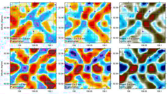 In Figure 5, we present several checkerboard tests aimed to verify the horizontal resolution of the model. In these models, we defined alternating positive and negative anomalies with amplitudes of ±14%. These anomalies remained unchanged with depth. In these tests, we added random noise with a mean magnitude of 0.1 s for both P and S wave data that roughly represent the mean uncertainty of time picking. This error enabled similar variance reductions after inversions of the synthetic models, as in the case of the experimental data inversion. Here, we consider three different models with anomalies having the lateral sizes of 1.5 km, 2 km, and 2.5 km. In all cases, we show the results at 2 km depth b.s.l. The number of iterations and inversion parameters was the same as for the main model derived from the experimental data. In the recovered models, we observe that, for smaller anomalies, the resolution is limited in some parts; however, the larger anomalies are robustly resolved throughout the study area. It is important to note that the Vp/Vs ratio, which was calculated by a simple division of the derived P and S wave velocities, is robustly resolved despite of different sensitivity of the P and S models.