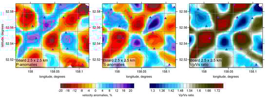 The derived model appears to be highly heterogeneous. The amplitudes of the P and S anomalies reach 15–20%. In some parts, the P and S anomalies are anti-correlated, which results in intense Vp/Vs ratio variations, ranging from 1.3 to 2. The variance reduction of the residual during five iterations of the inversion is presented in Table 2. For the P and S data, the reduction is 14% and 20%, respectively, which is relatively low. However, similar reductions were observed in some other volcanic studies [,]. This can be explained by the relatively small study area. Although anomaly amplitudes are high in the target area, the short ray distances do not allow accumulation of large residuals. They remain at the same order of magnitude as the accuracy of time picking, and the relatively low signal-to-noise ratio does not allow for high variance reduction. However, as was shown in Section 3 by synthetic tests with noisy data, such a low variance reduction does not preclude stable results. The higher reduction for the S-residuals can be explained by the higher sensitivity of S-waves to velocity anomalies (the same values of velocity anomaly lead to a larger residual for S rays than P-rays). Furthermore, in our data, the P-wave arrivals often cannot be picked due to the low amplitude of the signal, which is hard to detect in our noisy seismograms.