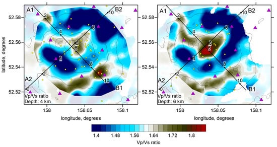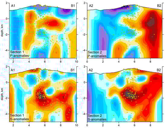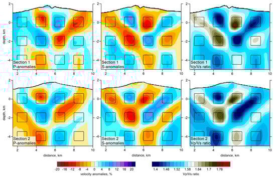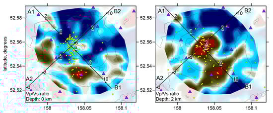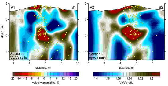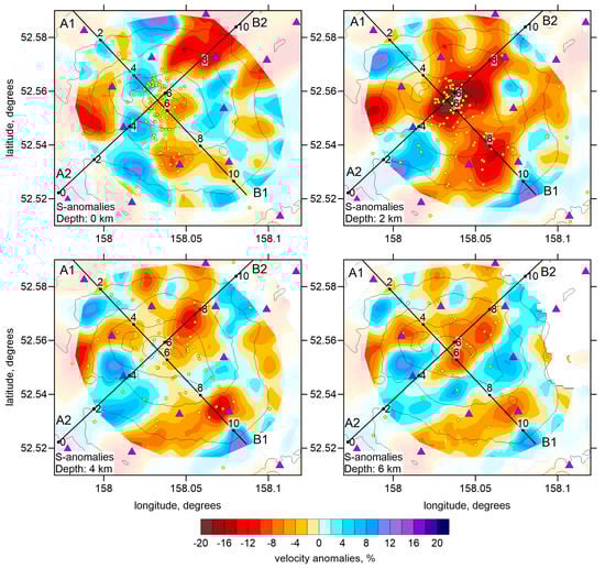 As a result of tomographic inversion, we obtained the three-dimensional distributions of P and S wave velocities and event locations. The Vp/Vs ratio was obtained by a simple division of the resulting velocities of P-waves to that of S-waves. The stability of this method was proven by a series of synthetic tests presented in Section 3. The resulting P and S wave velocity anomalies, with respect to the reference 1D velocity, and the Vp/Vs ratios are presented in several horizontal and vertical sections in Figure 7, Figure 8, Figure 9 and Figure 10. The seismic models are accompanied with distributions of localized seismic events in the vicinity of the sections.