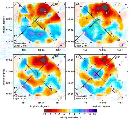 In the horizontal sections of the P-wave velocity anomalies (Figure 7), we observe an isometric high-velocity anomaly just beneath the summit of Gorely. It is surrounded by a circular band of low-velocity. This is a typical volcano-associated structure, which was previously observed in many other studies [,,]. The higher velocity likely corresponds to the volcano edifice consisting of rigid solidified igneous rocks. The surrounding lower velocity anomaly may represent the deposit of soft pyroclasts. The S-velocity structure (Figure 9) shows completely different structures: most intensive low-velocity anomaly is observed beneath the volcano center, in the location where the positive P-velocity anomaly was observed. Such anticorrelation of the P and S-wave velocity anomalies is a typical feature observed in many active volcanoes during their unrests. For example Kasatkina et al. [] found that beneath the Mt. Redoubt, after beginning of an eruption in 2009, the positive S-wave velocity anomaly changed to a strong negative one, whereas the high P-wave velocity anomaly remained almost unchanged. For the Redoubt eruption, this was explained by strong saturation of the magma sources by fluids and melts that strongly affects the S-velocity. We propose that similar saturation took place beneath the Gorely volcano during its activity period in 2014, when the network was installed.
