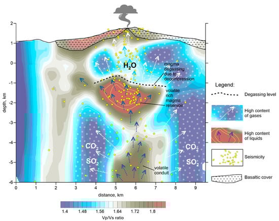 The upper limit of this high Vp/Vs anomaly is located 2.6 km below the surface, and roughly parallel to the topography line. The transition from a high to low Vp/Vs ratio can be interpreted as the degassing level, as schematically shown in Figure 11. A very similar feature was observed beneath the Nevado del Ruiz volcano in Colombia [] where the transition from high to low Vp/Vs was observed ~2 km below the surface, and was coherent with the relief. We propose that, at Gorely, this boundary represents the degassing level of water saturated in a magma reservoir located at depths of 2–4 km below the surface (reddish anomaly in Figure 11). Note that most seismicity is observed within and above this reservoir, which may represent gradual stages of H2O extraction from the melt and degassing.