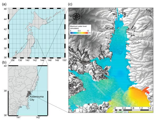 Overview of the study area with the numerical calculation of the 2011 Tohoku tsunami. (a,b) Wide-area view of the study area, (c) Central part of the study area with the simulated 2011 Tohoku tsunami.