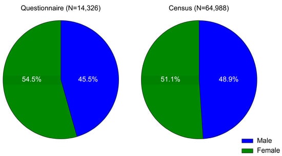 Figure 2 illustrates a comparison of the sex composition ratio between the survey and the latest census in 2015. Although the survey result included a higher percentage of females than that in the census result, the survey result yielded a similar sex comparison ratio. Figure 3 shows a comparison of the age composition ratio for the same data. Here, a small difference exists in the range of ages between the survey and the census. The survey obtained answers from a wide variety of ages, and there were no substantial differences between the survey and the census. The comparisons above indicate that the survey quality is satisfactory, i.e., statistical analysis is expected to return useful knowledge for assessing and discussing actual evacuation behaviours in the target area.