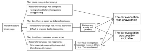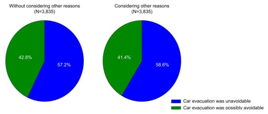 Next, the reasons for car usage were summarized, and the potential avoidability of car evacuation was investigated. The responses indicate a number of important issues, including the reasons for car evacuation for vulnerable people and numerous reasons that were considered to be avoidable in terms of saving lives. Based on the systematic criteria described in Figure 4, the proportion of possible avoidable car evacuations was estimated at 40% of the total usage. Since the evacuation situations of individuals cannot be fully taken into account in the questionnaire survey, this numerical value is considered a reference; however, this result suggests that a large proportion of car evacuations may be associated with unnecessary usages.