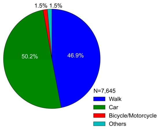 Figure 6 shows the composition ratio of the evacuation mode choice for the 2011 event. Only a few residents (1.5% of the residents) chose the bicycle and motorcycle modes during the event. Given the topographical features of the target area, most of the residents could reach safe high locations; however, 50.2% of residents used their cars to evacuate, a slightly larger number of residents than those whose evacuation mode was on foot. In summary, approximately half of the residents chose car evacuation, and the rest of the residents chose on-foot evacuation.