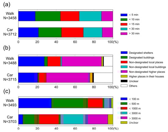 Differences in the evacuation metrics were analysed and are summarized in Figure 7. Since the above findings indicated that almost all of the residents chose on-foot or car evacuations during the 2011 event, these two modes are considered in the analysis. There were no significant differences in tendencies between evacuation modes for the evacuation departure time or destination, except for the ratio of other destinations, as shown in Figure 7b. A possible reason for this difference is that car evacuations are generally not vertical evacuations but horizontal evacuations because car evacuations can lead to long travel distances over a short time. Therefore, the ratio of other destinations reflects the ratio of people who evacuated to regions outside of the tsunami inundation area. A significant difference can be confirmed in evacuation distance. In contrast to the fact that approximately 70% of residents evacuated within 500 m by on-foot evacuation, less than 20% of residents moved within 500 m using cars. These results suggest that most of the car evacuees preferred to horizontally evacuate during the 2011 event, and as a result, the evacuation distances of car evacuations were greater than those of on-foot evacuations. These results are consistent with detailed spatial evacuation tracking and actual evacuation scenarios [], indicating that there were large traffic jams on routes leading out of the inundation area.
