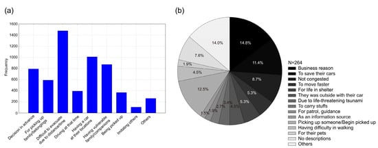 The results in the previous section showed a high percentage of car usage during the 2011 tsunami. In this section, we analyse the reasons for car usage. Figure 8a shows the various reasons for car usage, along with the categorized reasons in “Others” in Figure 8b that appeared in the structured questionnaire. Here, inappropriate usages are visualized in dark colours, whereas appropriate usages are shown in bright colours in Figure 8b. As shown in Figure 8a, the dominant reason was “difficult to evacuate due to distance/time”, followed by “having a car at their location”, “having vulnerable family/companions”, and “decision in advance”. The most notable finding is that reasons that are not considered appropriate reasons alone, such as “having a car at their location” and “decision in advance”, have large numbers of responses. Predominant reasons found as “Others” include “business reasons” and “to save their cars”; those reasons are inappropriate reasons for car usage in terms of saving lives.