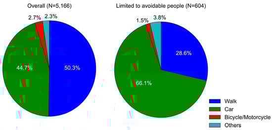 Evacuation mode preferences in future tsunamis based on different individual characteristics are shown in Figure 10. Here, we investigated the preferences of all the people in the survey (a) and those who made avoidable decisions (b), as estimated in the previous section. This study is the first to investigate the future evacuation mode preferences of people with different individual characteristics. Even for local residents who experienced severe traffic jams in the previous event, nearly half of the residents will require car evacuations in future tsunamis. Moreover, the demand exceeds 60% when the set of responders is limited to the people whose car evacuation was potentially avoidable during the 2011 event.