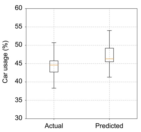 To assess the robustness of the estimated model, we conducted K-fold cross validation. The validation results are shown in Figure 11. In this figure, the actual percentages of car usages and the predicted car usages for 11 subsets of data are visualized using a whisker box plot. Here, the edges of the box plots represent the maximum and minimum values of the percentage among the 11 data sets.