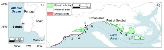 Coastline land use of the studied area: (a) Location of Setubal municipality; (b) Main exposed areas, with the location of the urban area and the Port of Setubal at the centre. 1—Portinho da Arrábida beach; 2—Galapinhos and Galapos beaches; 3—Figueirinha beach; 4—Outao campsite and beach; 5—Comenda park; 6-Albarquel park. Seveso industrial companies: A—Secil; B—Sapec Agriculture; C—Sapec Chemical; D—The Navigator Company; E—Tanquisado.