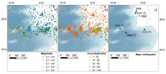 Seismicity in southern Portugal mainland, adapted from [22]: (a) Magnitude; (b) Focal depth. Data from USGS, from 14 December 2000 to 14 December 2007; (c) Major earthquakes. (T) indicates earthquakes that triggered tsunamis. The epicentre of 1858 is unknown.