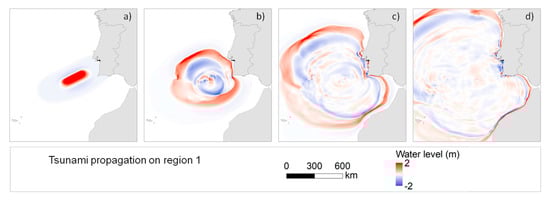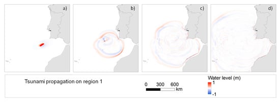 Tsunami propagation results obtained for region 1 in the 1969 tsunami are shown in Figure 5. Initial sea surface displacement was +1.7 m. The water level snapshots show how the 1969 tsunami waves spread out from the tsunami source area, reaching Setubal municipality within 40 min of the earthquake. At the regional scale, several tsunami waves propagated in the region under study, being less than 1 m in height at the coasts of Portugal, southern Spain, and Morocco.