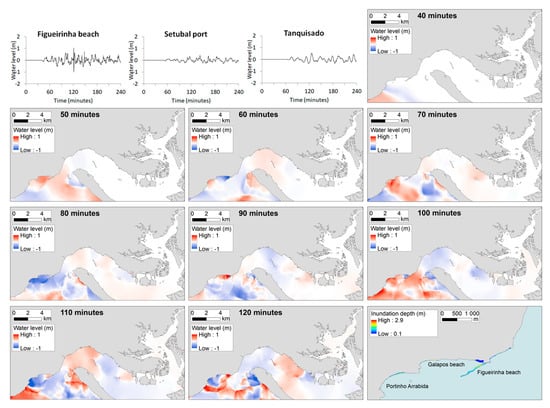 The numerical model of the 1755 tsunami in computational region 5 is represented in Figure 10, Figure 11, Figure 12 and Figure 13. The water level waveforms (Figure 10) show that over the four hours of computation time, there were several waves hitting Setubal, but there were clearly three major waves (over 2.5 m in height) at the port of Setubal. This is supported by witnesses’ accounts, as reported and discussed by [1,39]. In addition, the tsunami water level snapshots show the first tsunami wave arriving at the beaches located on the west of the municipality within 30 min, which was approximately 2.5 m in height. The tsunami continued to propagate up the Sado River reaching the urban area within around 40 min of the earthquake. The second wave was the highest calculated wave, arriving at Setubal municipality within 90 min after the earthquake. This wave was responsible for most of the inundation of the coastal area, reaching approximately 5.8 m in height at Figueirinha beach and at the Tanquisado company (locations of Figure 1). Therefore, for evacuation purposes, coastal communities should be aware that this is the maximum time available for a safe evacuation, whereas the minimum is given by the tsunami travel times, which is the arrival of the first wave. The third wave arrived within two hours of the earthquake; therefore, coastal communities should also be aware that they have to remain on high ground for at least four hours after an earthquake.