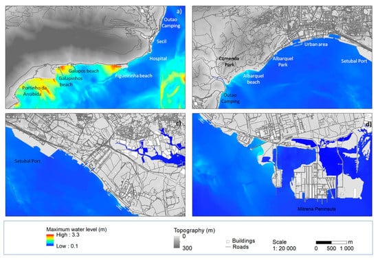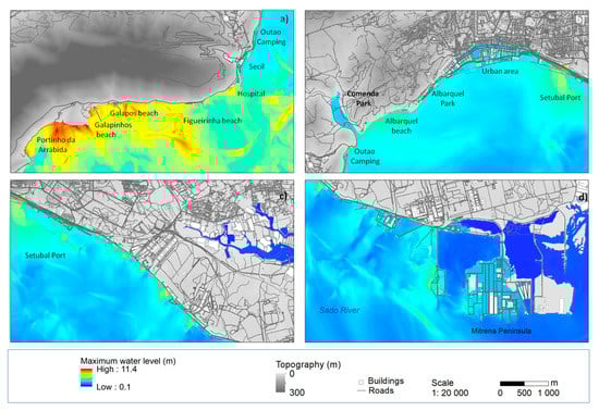 The maximum water level has the highest values in the western part of the municipality, at the beaches, where it varies between 6.4 and 11.4 m (Figure 11), while the absolute maximum of 11.4 m was calculated to be near Portinho da Arrabida. Next, the maximum water level varies between 4.2 and 5.1 m near the Outao Campsite and Comenda Park (Figure 11b), at approximately 5.8 m at the port of Setubal and approximately 3.8 m at the marinas. Further east (Figure 11c), the maximum water level varies between 3.7 and 6.4 m at the various companies’ docks. In the Mitrena Peninsula (Figure 11d), the maximum water level decreases, varying between 0.67 and 5.6 m.