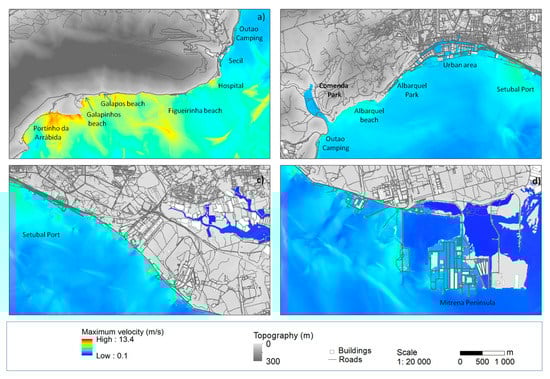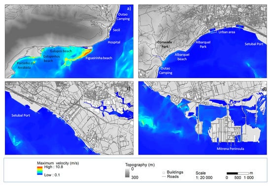 Maximum velocity of the 1755 tsunami: (a) Western area; (b) Central area, including the urban area; (c) Eastern area, including the industrial area; (d) South-east area where the Mitrena Peninsula is located.