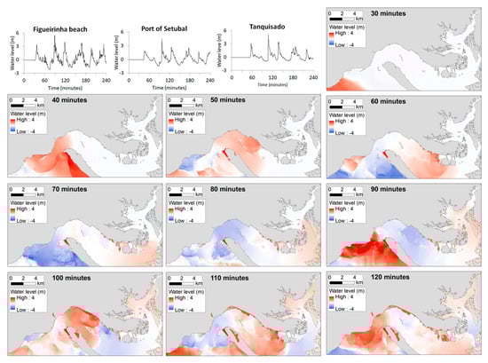 The second scenario was the 1755 tsunami. Tsunami propagation results obtained in computational region 1 are shown in Figure 6. Initial sea surface displacement was +6 m. The water level snapshots show how the tsunami waves spread out from the tsunami source area over the selected computational region. The first tsunami wave reached Portugal in about 15 min, which is consistent with previous tsunami numerical modelling at the regional scale [38] and local scale [41]. In addition, the tsunami arrived in Setubal municipality within 30 min after the earthquake, which is about 10 min earlier than the 1969 tsunami. Thus, the 1755 scenario allows Setubal’s coastal communities a shorter evacuation time than the 1969 scenario.