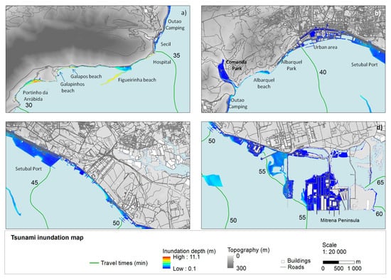 In addition, the inundation depth map of the 1755 tsunami (Figure 13) shows that the total area affected by the tsunami would have been 17.7 km2. All the beaches located in the west of the municipality (Figure 13a) are inundated with an inundation depth of 1.2 m to 9 m. The only industrial plant located in the western part of Setubal is Secil (location on Figure 1). Its ship dock is completely inundated, with an inundation depth of up to 4.1 m. The Outao campsite is completely inundated with inundation depths of 0.57 to 4.4 m. Figure 13b shows that the central part of Setubal is inundated up to 4.9 m, and in general, is approximately 1 m high at Albarquel park, less than 0.5 m in the urban area, and less than 2.0 m at the port of Setubal. In addition, the urban area is inundated to 400 m inland, reaching the streets and buildings downtown. A study focused only on the tsunami vulnerability in the Setubal urban area [52] showed that the 1755 tsunami would potentially affect 481 buildings and 923 residents (equivalent to about 0.8% of the total for the municipality [52]). An author [53] presented new formulas to include damage on the buildings; however, that was not considered in this research. Still, the tsunami vulnerability study [52] showed that there are two buildings in the moderate vulnerability class, 26 in the low vulnerability class, and 453 buildings in the very low vulnerability class. Next, for a stretch of approximately 3 km, the inundated area is approximately 50 m wide and restricted to the road (Figure 13c), which is inundated up to 2 m high. In the southeast area of Setubal, the Mitrena Peninsula (Figure 13d) is almost completely inundated reaching an extension of over 1.2 km. Inundation depth reaches approximately 4 m, but in general, it is 2 m on the left facility and 0.1 m on the right facility. However, the access to these companies’ roads is inundated to approximately 1.5 m high. The inundation of the roads would most likely cause some damage to the roads, so the access to the companies could be compromised. Furthermore, Figure 13 also shows the tsunami travel times which indicate the recommended evacuation times for coastal communities. These are 30 min at the beaches, 40 min in the urban areas, and at least 45 min in the eastern area, where the industries are located.