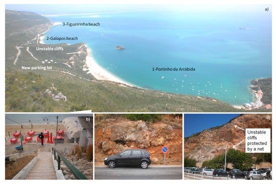 West of Setubal, the stretch of beaches is famous for its beauty and natural landscape because it is located within the Arrabida Natural Park, which is classified as a Protected Natural Area [2]. For these reasons, the beaches are popular among residents and tourists, especially during summer. Also, in the same area, there are unstable cliffs [3,4,5]. Thus, in order to provide some protection to beach users, the cliffs have undergone significant intervention. Nevertheless, evacuating crowded beaches in an emergency situation is difficult, especially if there are narrow beach access points with many stairs.