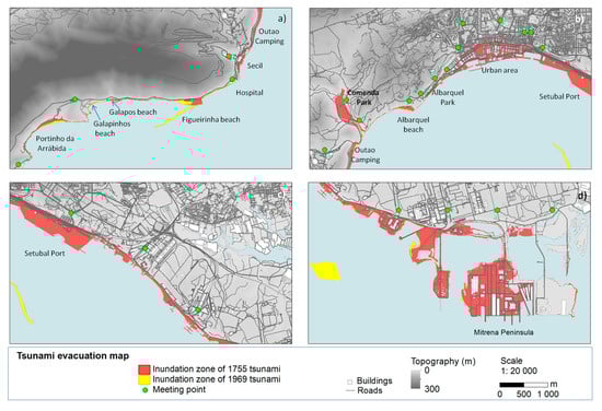 Tsunami evacuation map: (a) Western area; (b) Central area, including the urban area; (c) Eastern area, including the industrial area; (d) South-east area where the Mitrena Peninsula is located.