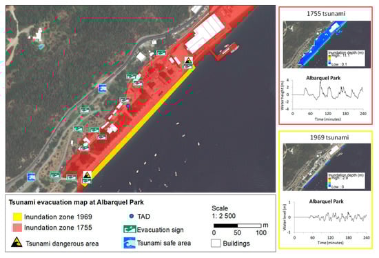 Furthermore, after the drill at Albarquel park [8,9], the SMPCB installed permanent tsunami evacuation signs in the park (Figure 16). Although there is no general consensus regarding the use and installation of tsunami signs, this research follows the guidelines of the ITIC [51]. The tsunami evacuation map provides a variety of information to the public, including the location of tsunami safe areas and how to reach them. It also includes direct outputs of the tsunami numerical model, like the inundation zone, inundation depth, and water level waveforms. In addition, the implementation of tsunami evacuation maps allowed tsunami risk areas to be identified, making the coastline safer for coastal communities. Also, after the 2012 and 2016 drills, there was an increase in information and training on natural hazards for the staff of the industries, including workers and their supervisors, as well as first responders. Education and awareness of the tsunami risk in Setubal will allow future disasters to be mitigated, which in turn, will lead to more resilient communities. For this reason, a new earthquake and tsunami drill is being prepared for November 2017 in the urban area.