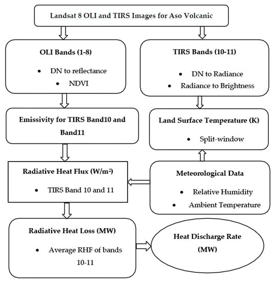 Satellite remote sensing is presently an essential part of volcanology in terms of monitoring thermal or eruption activity of the most active volcanoes. Thus, continuous thermal monitoring can be used to detect the thermal behavior of the active volcano so as to explore the geothermal system. In the early stage of volcano monitoring and resource exploration, ground measurement could be expensive and time-consuming, difficulties due to unstable ground in the national park around the active volcano region were faced. In this stage, satellite thermal infrared data can be used to estimate the land surface temperature (LST) anomaly and the radiative heat flux (RHF) of any volcano within several hours after image acquisition. It is well known that satellite images can only be used for the radiative portion of the heat flux, not the conductive and convective heat flux, but there should be a relationship between RHF and the total heat loss or (HDR) from any volcano. We utilized a relationship between RHF and HDR by the author’s recent works in this study [11]. RHF is the radiative portion of the surface heat loss that passed by the electromagnetic wave without any media, and HDR is the sum of radiative, conductive, and convective heat loss from any fumaroles of volcanoes [12]. There are presently a number of studies of successful volcano monitoring using satellite images for the surface temperature anomaly, and some of these have focused on heat loss [11,13,14,15,16,17]. Low-resolution satellite images, namely, MODIS, NOAA-AVHRR, MSG-SEVIRI images, taken during or after the eruption, are mostly used for thermal anomalies, ash detection, or eruption monitoring of active volcanoes [18,19,20,21]. Most notably, Landsat TM/ETM+ sensors have a long history of volcano or geothermal studies [6]. The major limitations of Landsat TM/ETM+ images are single thermal bands, image gaps in the ETM+ sensor after 2003, and the non-availability of Landsat TM images after 2009 of the study area. Recently, the Landsat 8 satellite was launched with two sensors, OLI and TIRS, in 2013. The TIRS sensor has two thermal bands with a 100 m resolution and supplies the thermal data with resampled 30 m imagery from the United States Geological Survey (USGS) archive. The TIRS Band 11 has some uncertainties due to stray-light problems, and the USGS tried to refine and implemented the Landsat product generation system in early 2017. Presently, high-quality images supplied as Landsat collection-1 data from the USGS archives have narrowed the uncertainty associated with stray light [22,23]. The OLI sensor has nine visible to infrared bands with a 30 m resolution. TIRS images are now used for land surface temperatures, but no study has used them for volcano thermal heat estimation and monitoring. To overcome the limitation of a single thermal band and the image gaps in previous Landsat sensors, the current initiative was to assess the thermal status of the recent abnormality of the Aso volcano using Landsat 8 TIRS images for the first time in this study area with the split-window algorithm for LST and the NDVI-threshold method of emissivity measurement.